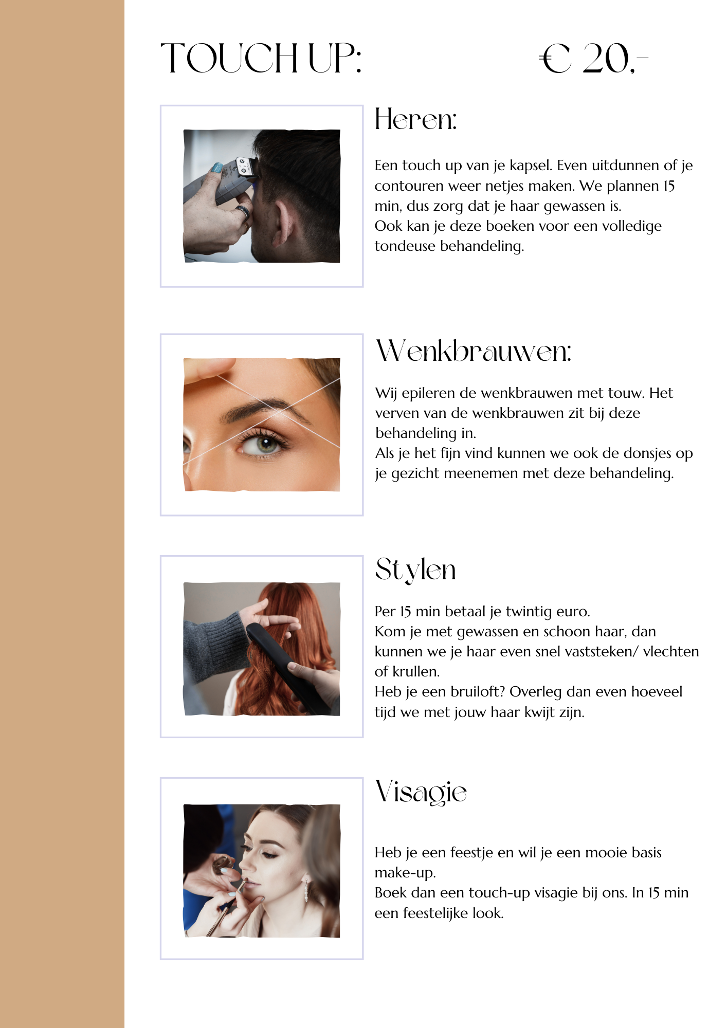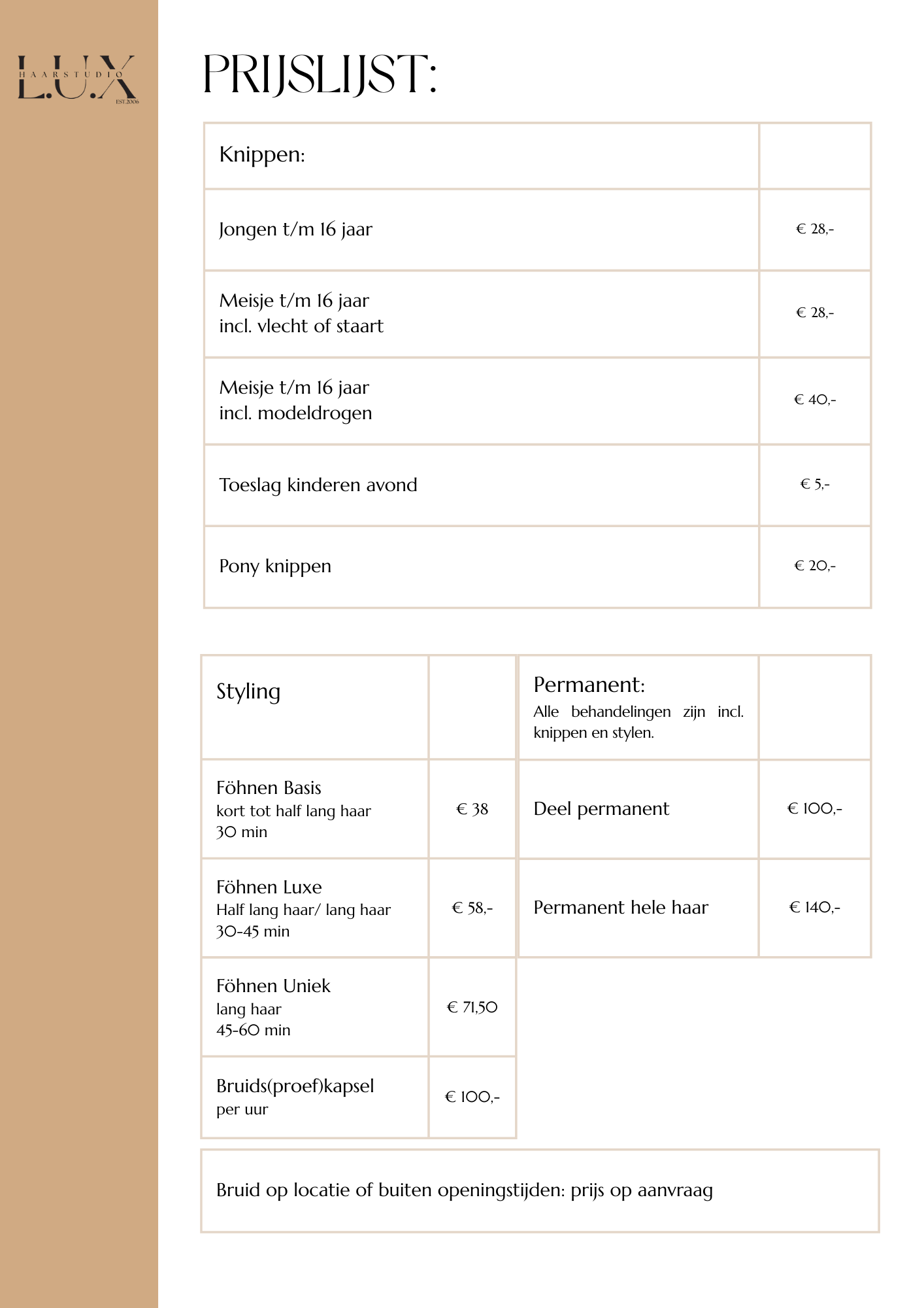 Hier vindt u een overzicht van onze behandelingen en prijzen. Voor vragen kunt u altijd telefonisch contact met ons opnemen.